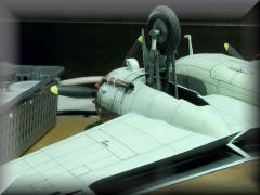 To avoid dust and stability testing by my two cats, I build a vitrine. The baseplate is dark grey plastic and the cover is made of plexiglas (acrylicglas), which I glued (welded) with Dichlormethan (methylene chloride). The two wheel chocks, which you see on some pictures, were home made by etching parts.