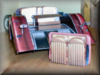 Now the fun starts! The largest part H12, the rear body section, is npw joined to the two sides of the car. The two-color scheme now shows up and the cream against crimson looks very elegant. A fair amount of patience is required here to allow tags and tongues to dry, as the whole thing now becomes a bit unwieldy. The inner liners of the door frame provide a door stop, and the hole in the back of the trunk provides a position for the very final dowel to hold the last two spare wheels.