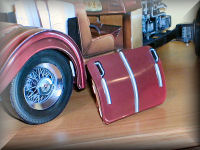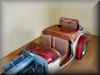 This section starts with the construction of the rumble seat back, and the portion of the bodywork that will swivel down, hiding the rumble seat to create the cover to the trunk/boot. One of the last dowels is used in this stage and it is best to make sure that the dowel does in fact fit through all the holes in the brackets before the assemblies dry. The seat is built up section by section, until a very strong and moveable part is obtained. Two grab handles are mounted on the trunk lid to facilitate opening to reveal the interior rumble seat. Cool design....