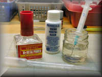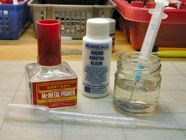 Tip: Cyanoacrylate or superglue is a very important little helper for every model builder but, unhappily, it is nearly impossible to use the little bottle until it is really empty. It often ends up unusable because the opening becomes completely blocked by dried superglue, after only 20% to 30% of the contents have been used. I try to get around this by using hypodermic syringes with small needles to apply the glue. I draw a little bit (1-2 ml) out of the original bottle and after using I park the syringe with the needle downward in a glass of acetone (nail polish remover), which also serves as a thinner for superglue. If the needle becomes plugged by glue, I heat it with a cigarette lighter (very carefully), and this will burn out the glue and free the needle. (Don't push the plunger of the syringe while you're doing this or you will get a flamethrower!) This way, the original glue bottle will stay clean for a longer period of time and can be used nearly to the end. It's also a good idea to store superglue in the refrigerator to help make it usable for a longer period of time.