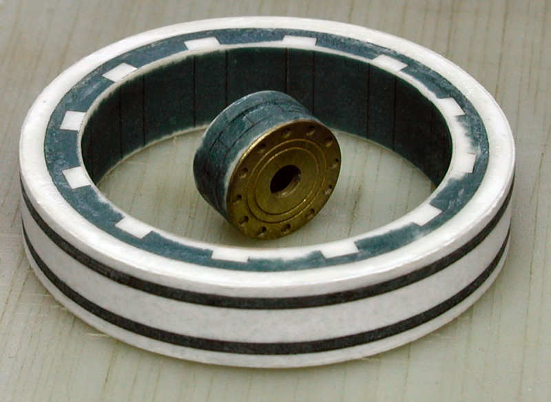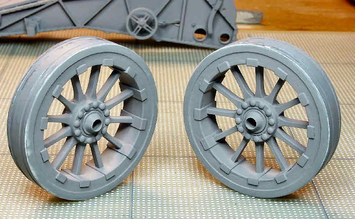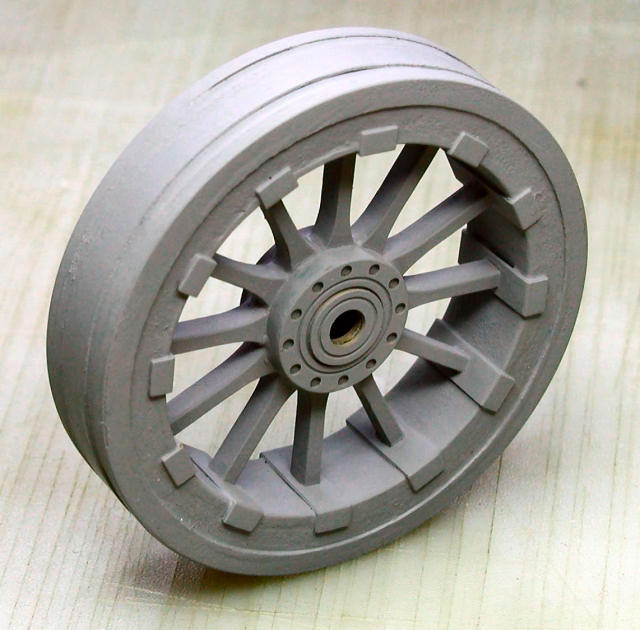 The main carriage wheels were completed after I redid the outer surface (the part that contacts the ground). I happened to make a little mistake, the middle strip of the tread was not exactly in the middle, so I ground it away and added a replacement piece. The little cone near the axle was made with the original paper part and strengthened with superglue.