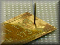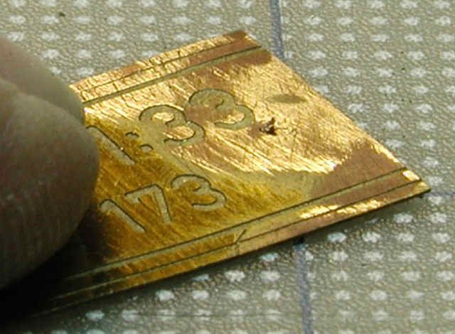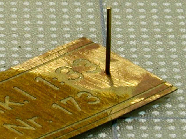 All rivets were real ones, made of brass, purchased from Hassler-Profile in Liechtenstein. They have a shaft of 0.5 mm and a head of 0.8 mm. After shortening the shaft to a length of 0.3 mm (thickness of the brass sheet), I glued them with Gunze's Mr. Metal-Primer into the etched holes.