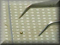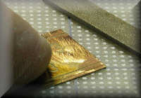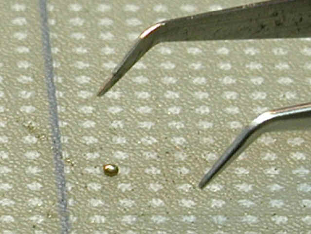 Tip: Working with very little rivets is not so difficult. Make a hole of the correct diameter (same as the rivet's shaft) in the right spot on the model. If you want do mount the rivet in 0.3 mm sheet metal, you also need a scrap piece of the same material with the same size hole. Put the rivet in the hole of the scrap material and cut the excess length with side cutters to make it as short as possible. Take a fine needle file and remove the rest of the shaft until it is flush with the scrap metal. Remove it and turn it, so that the round head is at the top. Apply it with very fine tweezers in the hole at the model and attach it carefully with very thin colorless paint. (I use Gunze's Mr. Metal Primer). I've found the best tweezers to be those used for handling very small surface-mounted electronics components. [Editor's note: Look for these on the Internet from electronics tool distributors.]