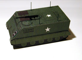 I recently assembled the US Army M113-A1 Armored Personnel Carrier model included in the Summer, 2000 edition of The Carformation Newsletter. This is the first armor model that I have built. The somewhat diminutive model (at least to my hands) measures approximately 2-5/8 in. long, 1-7/16 in. wide, and 1-3/8 high to the top of the antennae (67mm, 37mm, 35mm respectively-isn't the English System awful!). It is a semi-scale model at approximately 1/72nd scale.