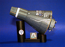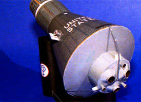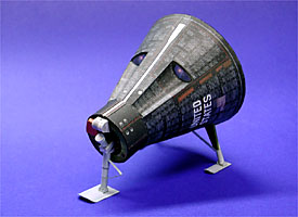 favorite) using six colors (CcMmYK) with a Canon BJC-6000 printer. The model is sizeable at a full length of approximately 7.4 inches/18.7 cm. Dan suggested to me that I do a butt joint on the seam of the capsule body and that worked just great. I also did the same for all but the tiniest parts. However, there are a couple of tiny rocket nozzles for which this would be impossible. The retrograde nozzles for example. To keep up the appearance, I just turned them over after coloring the edges and gently sanded the overlapping edge to a thin wedge using a nail board. This was easy on this model since I had colored the insides black.